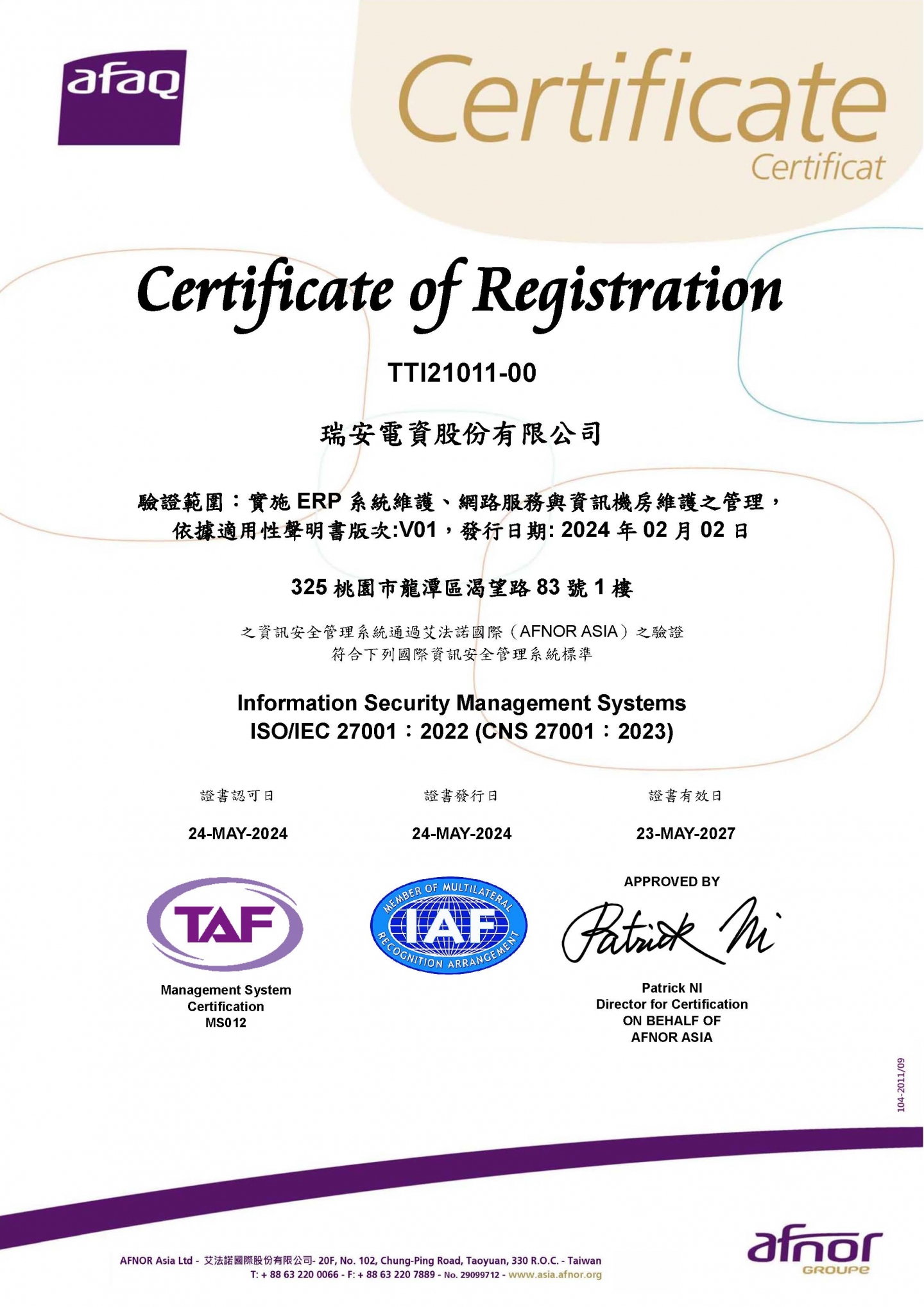 為提高客戶對瑞安電資服務信心,2023年8月成立資安小組,2023年11月全廠推動資訊安全活動,2024年4月通過ISO-27001:2022資安管理系統驗認,2024年5月取得證書